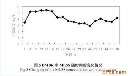 DMBR 的(de)接種(zhong)(zhong)污泥(ni)(ni)來自實驗(yan)室氣升循環(huan)膜(mo)生(sheng)物(wu)反應器(qi)(qi)的(de)生(sheng)物(wu)池(chi)(chi),接種(zhong)(zhong)量(liang)(liang)(liang)為3.45g/L。前十(shi)天,DMBR污泥(ni)(ni)的(de)馴(xun)化(hua)采用(yong)了人工(gong)配水(shui)和(he)水(shui)解池(chi)(chi)出水(shui)按2:1 的(de)比例投加(jia)的(de)方式,此(ci)間的(de)污泥(ni)(ni)濃(nong)(nong)度(du)有所上升,到第(di)12天,污泥(ni)(ni)濃(nong)(nong)度(du)最大到5.4g/L。此(ci)后,膜(mo)生(sheng)物(wu)反應器(qi)(qi)的(de)進水(shui)完全該(gai)為水(shui)解池(chi)(chi)出水(shui),混合(he)液污泥(ni)(ni)濃(nong)(nong)度(du)開始下(xia)降,第(di)35 天降至最少(shao)2.9g/L,這與垃圾滲濾液的(de)成分(fen)復雜不適合(he)微生(sheng)物(wu)正常(chang)生(sheng)長需要有關,通過顯微鏡(jing)鏡(jing)檢可明顯看出生(sheng)物(wu)相遠(yuan)不及普通膜(mo)生(sheng)物(wu)反應器(qi)(qi)豐(feng)富(fu),而且數(shu)量(liang)(liang)(liang)也相對較少(shao),申歡(huan)在研(yan)究膜(mo)生(sheng)物(wu)反應器(qi)(qi)處(chu)理城市垃圾滲濾液時也發現了生(sheng)物(wu)量(liang)(liang)(liang)減少(shao)和(he)污泥(ni)(ni)活(huo)性降低的(de)現象[13]。隨后,補加(jia)接種(zhong)(zhong)了8g/L 污泥(ni)(ni)約1.5L,混合(he)液污泥(ni)(ni)濃(nong)(nong)度(du)有所回升。