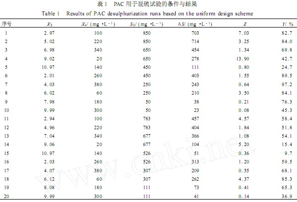 篩選了PAC作為脫硫絮凝劑,對其脫硫效果進行了較全面的研究。采用均勻設計法,對PAC投加量、原水pH和含硫量進行了考察。試驗共選用3因素10水平。含硫量采用擬水平。選用均勻設計試驗表為U10(102×5),D(均勻設計系數)為0.1878。
