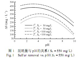 pH對脫硫量的影響見圖1。從圖1可見,pH對脫硫量有較大的影響,且存在最佳值。根據圖1推測以及式(8)、式(9)、式(11)和式(2)的計算可知,不同的PAC投加量時,Y(Z)—pH曲線也是一組平行線。