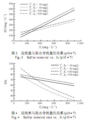 (2)pH為4時,單位PAC脫硫量達到最高值;隨著原水含硫量的增加,脫硫量和單位PAC脫硫量增加;由于原水含硫量和PAC投加量的不同,單位PAC脫硫量的最高值也不同;PAC投加量增加時,單位PAC脫硫量降低。說明增加PAC投加量,對提高單位PAC脫硫量是不利的。因此,需要根據其他參數選擇最佳的PAC投加量,以降低運行成本。