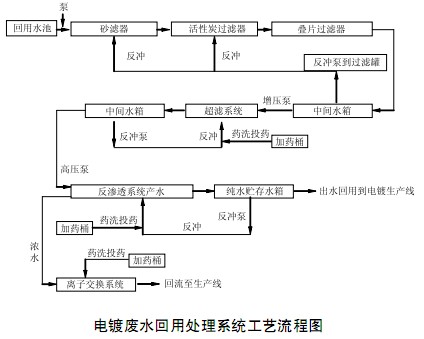 針對要將達到(dao)排(pai)放標準的電鍍廢水處理至可作為電鍍工(gong)藝用(yong)水的水質(zhi),回用(yong)處理系統(tong)采用(yong)了膜分離(li)技術,該系統(tong)的工(gong)藝流程如下圖(tu)所示。