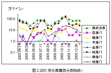2005年由于(yu)改變藻類的監(jian)測方法,藻類總體(ti)數量(liang)較往(wang)年下降了4倍左右。根(gen)據對密云水庫藻類品種的分析可以發(fa)現在藍綠藻衰退(tui)后和上升階段,用戶嗅味(wei)反映最強烈(lie),與相關研究(jiu)成果規律(lv)相同2、6。