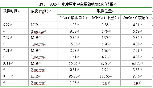 國內對嗅味(wei)(wei)物(wu)質無(wu)量(liang)化標準(zhun)(zhun),參考日(ri)本飲水標準(zhun)(zhun),嗅味(wei)(wei)物(wu)質2-MIB、Geosmin應達到10ng/L以(yi)下(xia);法國相關資料(liao)認為當(dang)2-MIB 濃(nong)(nong)度在5ng/L時便會產生2級嗅閾(yu)值3,因(yin)此對5-10ng/L的嗅味(wei)(wei)物(wu)質含量(liang)人(ren)便可感知。由表1可以(yi)確定,2005年原水9月(yue)初(chu)水庫(ku)原水2-MIB濃(nong)(nong)度高(gao)達100 ng/l以(yi)上,Geosmin濃(nong)(nong)度較(jiao)低,水庫(ku)水致(zhi)嗅物(wu)質以(yi)2-MIB為主(zhu),高(gao)出日(ri)本標準(zhun)(zhun)10余倍。2-MIB經過九廠常(chang)規(gui)+活性炭對2-MIB的處理未能達到10ng/L以(yi)下(xia),本年度出廠水和管網水主(zhu)要(yao)致(zhi)嗅物(wu)質為2-MIB,Geosmin對出廠水嗅味(wei)(wei)貢獻較(jiao)小。
