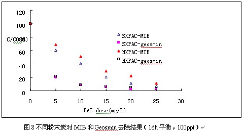 由圖7、圖8可以看出,為保證(zheng)充分利用(yong)PAC的吸(xi)附(fu)能力,延長PAC在(zai)工(gong)藝中(zhong)的接觸時間是非常(chang)必要的;同樣,與動(dong)力學結果(guo)一致,山西PAC吸(xi)附(fu)效果(guo)優于寧夏PAC,但(dan)對geosmin的效果(guo)影響不大。