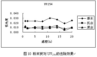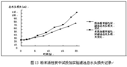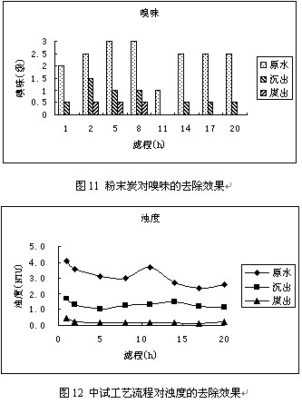任(ren)何技術方(fang)案的(de)(de)實(shi)施(shi),都必須對(dui)現(xian)有(you)(you)水廠生產工藝不能(neng)有(you)(you)過(guo)大的(de)(de)擾(rao)動。濾池的(de)(de)濾程和出(chu)水濁度(du)是直接關系到技術參(can)數的(de)(de)可靠性(xing)和可實(shi)施(shi)性(xing)。由圖13可見,投(tou)加(jia)(jia)(jia)粉末(mo)炭(tan)與未加(jia)(jia)(jia)試驗條件對(dui)照,雖然對(dui)濾池濾程無縮短的(de)(de)影響,相反有(you)(you)延長的(de)(de)趨勢。通(tong)過(guo)加(jia)(jia)(jia)藥(yao)絮(xu)(xu)(xu)凝(ning)過(guo)程,炭(tan)顆(ke)粒與藥(yao)劑(ji)形(xing)成絮(xu)(xu)(xu)體的(de)(de)顆(ke)粒比一般絮(xu)(xu)(xu)體比重大,有(you)(you)利于沉淀(dian)。根(gen)據濾池水頭損失增長趨勢來(lai)看,達到36小時反沖(chong)周期的(de)(de)可能(neng)性(xing)很大。因此投(tou)加(jia)(jia)(jia)粉末(mo)炭(tan)對(dui)濾池濾程和出(chu)水濁度(du)無明顯負面影響,建(jian)議生產中投(tou)加(jia)(jia)(jia)15mg/L粉末(mo)炭(tan),凈(jing)水藥(yao)劑(ji)PAC20mg/L。