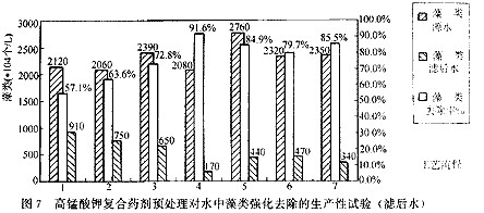 圖7是高錳酸鉀復合藥劑強化過濾去除藻類試驗結果,從中可以看出,(圖中序號所代表的工藝流程同表1,以下同)高錳酸鉀復合藥劑(CP)對藻類的去除效果遠較單獨聚合氯化鋁(PAC)和高錳酸鉀預處理為好,高錳酸鉀復合藥劑(CP)對藻類的去除率:濾后水一般都達80%以上,而高錳酸鉀復合藥劑的投量僅為0.24~0.5mg/l,混凝劑(PAC)的投量 2.7~5.4mg/l,去除率最高達到92%(PAC:2.7mg/l,CP:0.5mg/l);而單獨投加PAC:5.4mg/l時,對藻類的去除率:濾后水為57.1%;投加KMnO4 :0.5 mg/l預處理,PAC:5.4mg/l CP:0.5mg/l)預處理強化過濾去除藻類與單獨投加混凝劑聚合氯化鋁(PAC:5.4mg/l)和高錳酸鉀預處理(KMnO4 :0.5 mg/l)相比,在混凝劑聚合氯化鋁(PAC)節約50%的情況下,對藻類的去除率分別提高了34.7%和28.2%,優勢十分明顯。