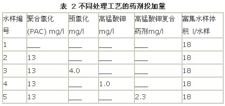 水樣編號、聚合氯化鋁的投加量、高錳酸鉀的投加量、氯的投加量、高錳酸鉀復合藥劑的投加量等數據詳見下表: