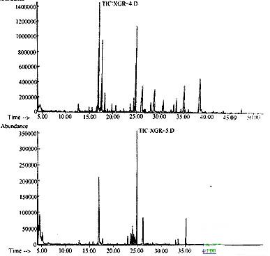 色譜條件:HP-5MS柱,柱長:30米,內徑:0.25mm,載氣:He 。進樣口溫度:250℃,接口溫度:280℃。進樣量:0.2μl,柱溫起始:50℃,保持5min,以5℃/min速度升至200℃保持1min,再以10℃/min,升值280℃,保留10分鐘。