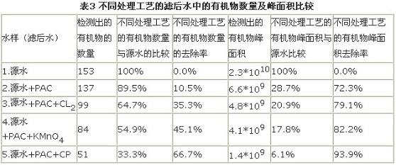 從表3中可以看出,源水檢出有機物數量為153個;源水+PAC為137個;源水 +PAC+Cl2為99個;源水+PAC+KMnO4為84個;源水+PAC+CP為51個。不同處理工藝的有機物數量與源水比較的去除率分別為:源水+PAC為10.5%;源水+PAC+CL2為35.3%;源水+PAC+KMnO4為45.1%;源水+PAC+CP為66.7%。