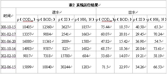 該工藝于(yu)2000年6月(yue)投入運行,同年10月(yue)通過(guo)環保部門的(de)驗收。經過(guo)2a多的(de)運行,處(chu)理效果穩定,各項(xiang)指示均達到(dao)行業(ye)排放標(biao)準。出水水質見(jian)表2。