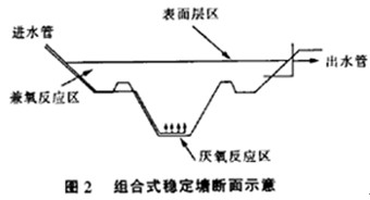 組合式穩定塘的工作原理是:從微生物類屬來看,塘分為3種微生物反(fan)應區(qu)。即(ji)厭氧(yang)(yang)(yang)反(fan)應區(qu)、兼氧(yang)(yang)(yang)反(fan)應區(qu)、好(hao)氧(yang)(yang)(yang)和藻類生長區(qu)。詳(xiang)見(jian)圖2組合式穩定塘斷面示意。