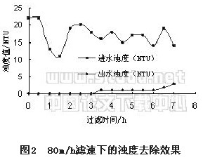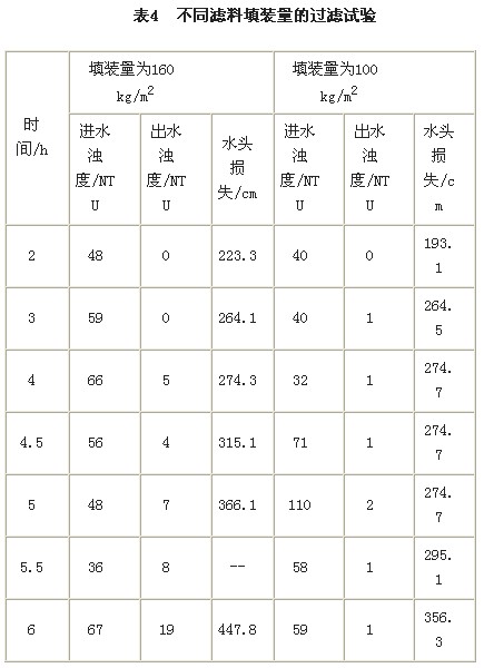表4為填裝量分(fen)別(bie)為160kg/m2和(he)100 kg/m2下(xia)的(de)進出水(shui)(shui)濁度(du)測(ce)量值(zhi)和(he)水(shui)(shui)頭損(sun)失(shi)值(zhi)。當(dang)繼(ji)續減(jian)少濾(lv)料(liao)填裝量至60kg/m2時,在過(guo)濾(lv)開始約1小時后出水(shui)(shui)濁度(du)迅速(su)升高,說明(ming)濾(lv)料(liao)填裝量不宜在60kg/m2以下(xia)。