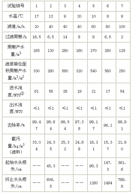 表1給出了彗星(xing)式纖維濾(lv)料壓力(li)過(guo)濾(lv)器進水(shui)平(ping)均(jun)濁(zhuo)度(du)在17-61NTU之間、濾(lv)速為(wei)20-100m/h的試驗結果[3]。