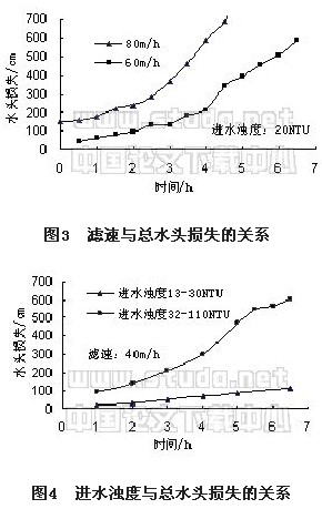 圖(tu)3為(wei)濾速分別在60m/h和80m/h下(xia)的(de)水(shui)頭損失(shi)隨時間變化的(de)情(qing)況(kuang);圖(tu)4為(wei)不同進水(shui)濁度下(xia)水(shui) 頭損失(shi)隨時間的(de)變化情(qing)況(kuang)。