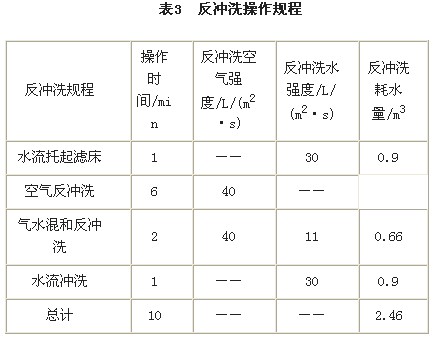 彗星(xing)式纖(xian)維(wei)濾(lv)料(liao)(liao)的(de)反沖洗(xi)(xi)(xi)(xi)采(cai)用(yong)氣(qi)-水聯合反沖洗(xi)(xi)(xi)(xi)。經過試驗確定反沖洗(xi)(xi)(xi)(xi)規(gui)程為:先以(yi)反沖洗(xi)(xi)(xi)(xi)水將(jiang)(jiang)濾(lv)床(chuang)托起,使濾(lv)床(chuang)略加膨脹,濾(lv)料(liao)(liao)間孔隙增大,然后(hou)進氣(qi)反洗(xi)(xi)(xi)(xi),進一步(bu)將(jiang)(jiang)濾(lv)料(liao)(liao)沖散。操作(zuo)條件見(jian)表3。