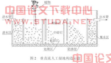 潛流式人工濕地構造由進水區、處理區、出水區三部分組成,并且底部應做好防滲層。垂直流人工濕地構造示意見圖2。