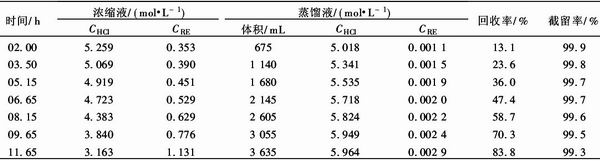 試驗中稀土反萃液CRE=0.6~0.9 mol/L, CHCl=2~2.5 mol/L,重稀土反萃液:CRE=0.2~ 0.4 mol/L,CHCl=4.5~5.5 mol/L,每次用料液 5 L,料液溫度62~63℃,冷側壓力8~10 kPa,料液 循環速度5.4 cm/s.