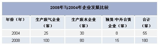 2004年,全國從事環境在線監測儀器的生產廠商約為55家,到2008年,增加到180家,增長了227%,2008年與2004年企業發展比較見下表。