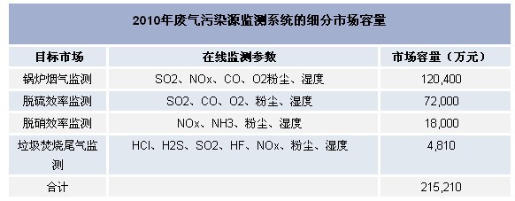 下表是2010年廢氣污染源監測系統的細分市場容量表: