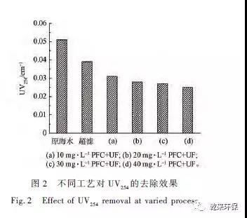 圖2 為超濾與微(wei)絮凝-超濾聯用工藝對海水中UV254 的去除效果(guo)。