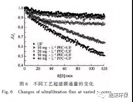 圖6 為(wei)不同(tong)絮(xu)凝劑投加(jia)量下海(hai)水(shui)超濾(lv)膜(mo)比(bi)通(tong)量隨時間的(de)變化情(qing)況(kuang)