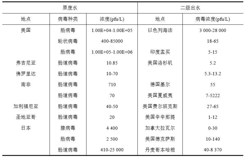 表1 部分國家原廢(fei)水及二級出水中檢(jian)出的病毒濃度