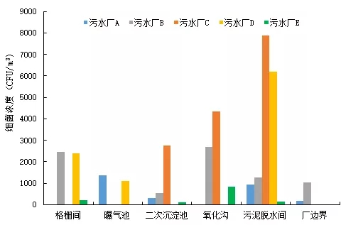 除(chu)了氣(qi)(qi)象(xiang)條件、處(chu)(chu)理(li)工(gong)藝(yi)因(yin)素外,其他因(yin)素也對微生(sheng)(sheng)(sheng)物氣(qi)(qi)溶膠(jiao)的產(chan)生(sheng)(sheng)(sheng)及傳播造(zao)成(cheng)重要(yao)影響。由表(biao)5、表(biao)6及圖2可(ke)以(yi)看出(chu),不同污(wu)水(shui)處(chu)(chu)理(li)廠即使在同一處(chu)(chu)理(li)設(she)施處(chu)(chu),其氣(qi)(qi)溶膠(jiao)中(zhong)微生(sheng)(sheng)(sheng)物濃(nong)度(du)也有差(cha)別。這是由于污(wu)水(shui)處(chu)(chu)理(li)廠的地理(li)位置、處(chu)(chu)理(li)規模、原水(shui)來(lai)源的多(duo)(duo)樣性,以(yi)及研(yan)究者采樣方(fang)法(fa)、培養方(fang)法(fa)、計數方(fang)法(fa)的差(cha)異性造(zao)成(cheng)的。李彥(yan)鵬等(deng)(deng)人與鄭云昊等(deng)(deng)人均提出(chu),微生(sheng)(sheng)(sheng)物氣(qi)(qi)溶膠(jiao)的分布存在顯著時(shi)間(jian)與空(kong)間(jian)差(cha)異性,其濃(nong)度(du)等(deng)(deng)特征的變化(hua)不但與降水(shui)等(deng)(deng)氣(qi)(qi)象(xiang)條件有關(guan),甚(shen)至(zhi)與多(duo)(duo)種污(wu)染因(yin)子有一定(ding)關(guan)系。