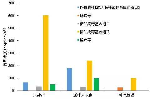 表1中(zhong)(zhong)展示了部分(fen)國(guo)家或(huo)地區在(zai)原廢(fei)(fei)水(shui)(shui)或(huo)二級廢(fei)(fei)水(shui)(shui)中(zhong)(zhong)檢測(ce)(ce)出的(de)(de)病毒(du)(du)濃(nong)度。雖(sui)然(ran)各個國(guo)家或(huo)地區的(de)(de)廢(fei)(fei)水(shui)(shui)中(zhong)(zhong)檢出的(de)(de)病毒(du)(du)濃(nong)度不(bu)一(yi),但(dan)不(bu)論是原廢(fei)(fei)水(shui)(shui)還是二級廢(fei)(fei)水(shui)(shui),均(jun)能(neng)檢測(ce)(ce)到病毒(du)(du)的(de)(de)存(cun)在(zai)。Katrine Uhrbrand等人在(zai)污水(shui)(shui)處(chu)(chu)(chu)理廠不(bu)同處(chu)(chu)(chu)理單元的(de)(de)水(shui)(shui)樣中(zhong)(zhong)均(jun)檢測(ce)(ce)到諾(nuo)(nuo)如(ru)(ru)病毒(du)(du)和腺(xian)病毒(du)(du),其中(zhong)(zhong)沉砂池水(shui)(shui)樣中(zhong)(zhong)的(de)(de)諾(nuo)(nuo)如(ru)(ru)病毒(du)(du)達到了1.79×103 copies/ml。病毒(du)(du)不(bu)但(dan)存(cun)在(zai)于待處(chu)(chu)(chu)理廢(fei)(fei)水(shui)(shui)中(zhong)(zhong),還能(neng)夠存(cun)活于氣(qi)(qi)溶(rong)膠化的(de)(de)液滴中(zhong)(zhong),并(bing)保持一(yi)定的(de)(de)傳染性。對醫(yi)(yi)院廢(fei)(fei)水(shui)(shui)進(jin)行處(chu)(chu)(chu)理的(de)(de)污水(shui)(shui)處(chu)(chu)(chu)理廠中(zhong)(zhong),待處(chu)(chu)(chu)理廢(fei)(fei)水(shui)(shui)病毒(du)(du)含量可能(neng)更高,但(dan)先(xian)進(jin)的(de)(de)處(chu)(chu)(chu)理工(gong)藝會大大減小病毒(du)(du)氣(qi)(qi)溶(rong)膠的(de)(de)產生。K. Uhrbrand等人對一(yi)所采用(yong)膜(mo)生物反應(ying)器(MBR)工(gong)藝的(de)(de)醫(yi)(yi)院廢(fei)(fei)水(shui)(shui)處(chu)(chu)(chu)理設施進(jin)行評估時(shi)發現,廢(fei)(fei)氣(qi)(qi)存(cun)在(zai)較低濃(nong)度的(de)(de)諾(nuo)(nuo)如(ru)(ru)病毒(du)(du)。
