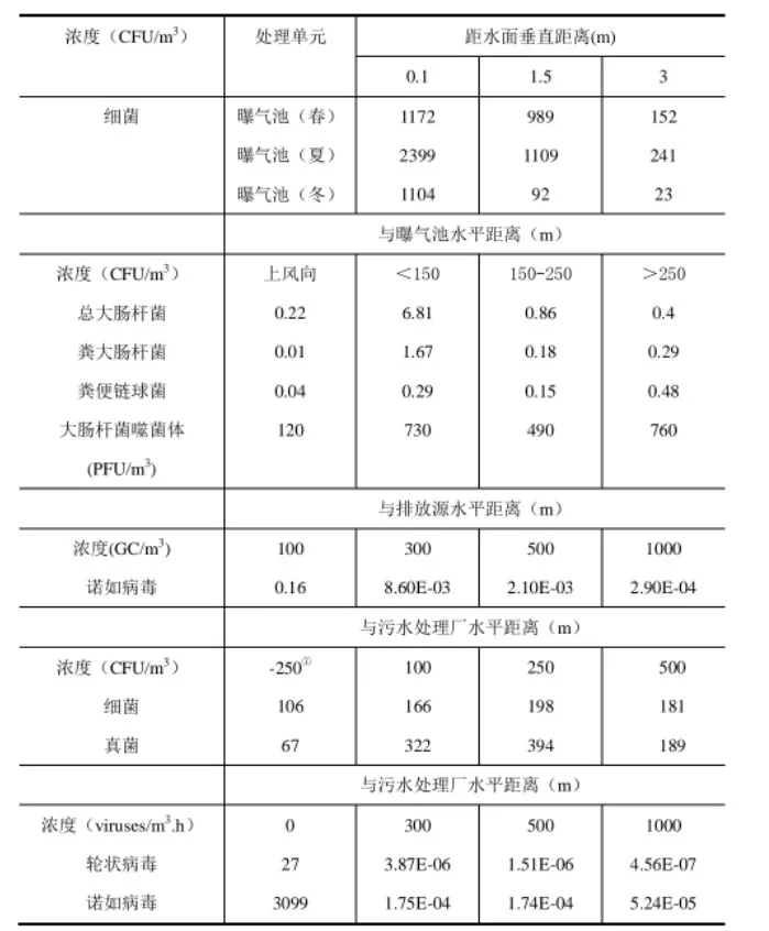 表4分(fen)(fen)(fen)別從與污水(shui)(shui)(shui)水(shui)(shui)(shui)面不(bu)(bu)同垂直距(ju)離及與污水(shui)(shui)(shui)處理(li)廠不(bu)(bu)同水(shui)(shui)(shui)平(ping)距(ju)離兩個角度(du),對空氣中微(wei)生物(wu)氣溶膠(jiao)濃(nong)(nong)度(du)進行總結。在春(chun)、夏、冬三季,采樣(yang)點與污水(shui)(shui)(shui)水(shui)(shui)(shui)面距(ju)離從0.1 m增(zeng)加(jia)(jia)到1.5 m時(shi),微(wei)生物(wu)濃(nong)(nong)度(du)分(fen)(fen)(fen)別降(jiang)低為原(yuan)水(shui)(shui)(shui)平(ping)的(de)(de)84.39%、46.23%、8.33%;距(ju)離從0.1 m增(zeng)加(jia)(jia)到3.0 m時(shi),微(wei)生物(wu)濃(nong)(nong)度(du)分(fen)(fen)(fen)別降(jiang)低為原(yuan)水(shui)(shui)(shui)平(ping)的(de)(de)12.97%、10.05%、2.08%。由此可見(jian),隨著(zhu)采樣(yang)點高度(du)的(de)(de)增(zeng)加(jia)(jia),微(wei)生物(wu)濃(nong)(nong)度(du)迅速下(xia)降(jiang);并且冬季微(wei)生物(wu)氣溶膠(jiao)濃(nong)(nong)度(du)下(xia)降(jiang)最為顯著(zhu)。Wang Yanjie等人在研究時(shi)還(huan)發現,與污水(shui)(shui)(shui)水(shui)(shui)(shui)面距(ju)離從0.1 m增(zeng)加(jia)(jia)到3.0 m時(shi),氣體(ti)中顆(ke)(ke)粒總量也(ye)在逐漸下(xia)降(jiang),且細顆(ke)(ke)粒物(wu)占比增(zeng)加(jia)(jia)。