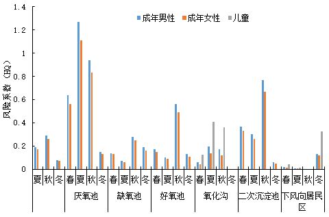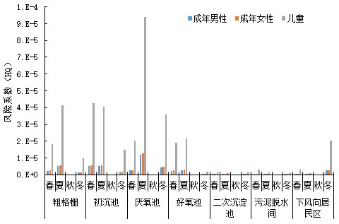 圖3中好氧(yang)(yang)(yang)池(chi)(chi)、氧(yang)(yang)(yang)化(hua)溝、生(sheng)(sheng)化(hua)反應池(chi)(chi)分別來自采(cai)用不同處(chu)理工藝的(de)污水處(chu)理廠。一般(ban)來說,成年(nian)男性的(de)暴(bao)露(lu)風險要(yao)稍(shao)高(gao)于女(nv)性,兒童(tong)的(de)暴(bao)露(lu)風險要(yao)遠(yuan)高(gao)于成人。夏季(ji)(ji)和(he)秋季(ji)(ji)的(de)暴(bao)露(lu)風險要(yao)高(gao)于春季(ji)(ji)和(he)冬季(ji)(ji)。大(da)部(bu)分處(chu)理單元(yuan)風險系數均(jun)小(xiao)于1,但(dan)在厭氧(yang)(yang)(yang)池(chi)(chi)處(chu)出現大(da)于1的(de)場景。因此應該(gai)將此厭氧(yang)(yang)(yang)池(chi)(chi)置于室內(nei),相(xiang)對封閉的(de)環(huan)境可以減小(xiao)微(wei)(wei)生(sheng)(sheng)物(wu)氣(qi)溶(rong)膠對外的(de)轉移。另外,經呼吸(xi)(xi)吸(xi)(xi)入造成的(de)健康(kang)風險要(yao)遠(yuan)高(gao)于皮膚(fu)接(jie)觸,可見(jian)呼吸(xi)(xi)吸(xi)(xi)入是較為重要(yao)的(de)微(wei)(wei)生(sheng)(sheng)物(wu)氣(qi)溶(rong)膠暴(bao)露(lu)方式。