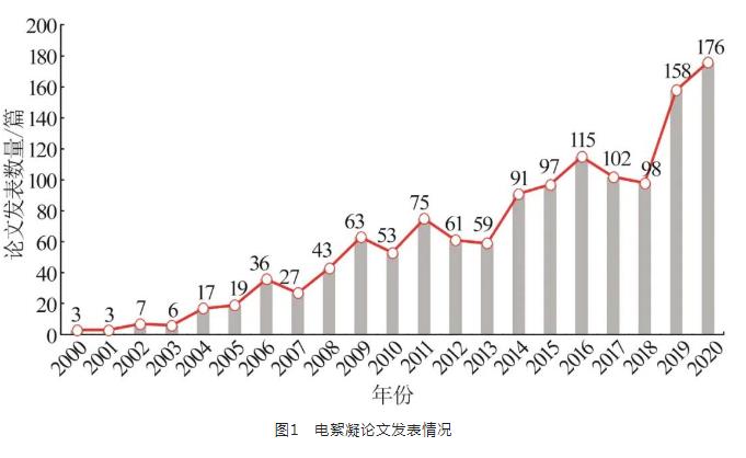 為了(le)清晰地(di)表明強(qiang)化電(dian)絮凝的發(fa)展趨勢(shi),先使(shi)用(yong)文獻計量(liang)學方法對Web of Science核心合集收錄(lu)主(zhu)題(ti)為“Electrocogulation”的論文進(jin)行了(le)統計分析,限(xian)定(ding)出版年為“2000年—2020年(12月18日(ri))”,限(xian)定(ding)研究方向為“Engineering Chemical”、“Engineering Sciences”、“Engineering Environmental”和“Water Resources”,對檢(jian)索得(de)到的論文建(jian)立數據(ju)庫(ku),電(dian)絮凝技術應用(yong)于環境領域(yu)的論文發(fa)表情況見圖(tu)1。