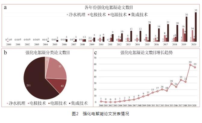 因此,筆者在“電(dian)(dian)絮(xu)凝”數(shu)據庫(ku)的基礎上,按照前文(wen)對強(qiang)化(hua)電(dian)(dian)絮(xu)凝的限定,分別(bie)以“凈水機(ji)理”、“電(dian)(dian)極(ji)技(ji)術(shu)(shu)”、“電(dian)(dian)源技(ji)術(shu)(shu)”和“集(ji)成技(ji)術(shu)(shu)”為類別(bie)進行整理歸納,強(qiang)化(hua)電(dian)(dian)絮(xu)凝論文(wen)發表情況見圖2。