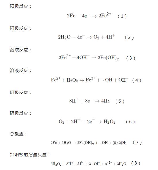 1.鐵電絮凝過(guo)程中(zhong),不同(tong)pH范圍(pH分別為2、7、12)表現出不同(tong)的(de)機理。在pH為2時(shi),反應方(fang)程式見式(1)~(7)。而要(yao)進行式(4)的(de)反應生成·OH,理論(lun)上(shang)需要(yao)體系中(zhong)有可生成H2O2的(de)O2存(cun)(cun)在,因此D. GHERNAOUT認為只有當pH為2時(shi)才存(cun)(cun)在生成·OH的(de)可能性;