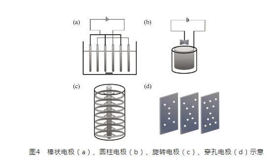 電(dian)(dian)極的(de)(de)(de)(de)幾何形(xing)狀會影(ying)響(xiang)反(fan)應器(qi)的(de)(de)(de)(de)構型,除污染物去(qu)除性能上的(de)(de)(de)(de)差異外,還會影(ying)響(xiang)反(fan)應器(qi)的(de)(de)(de)(de)放大、運行及經濟性。傳統(tong)電(dian)(dian)絮凝(ning)研究(jiu)中最常使用的(de)(de)(de)(de)為平(ping)板電(dian)(dian)極,而近十年來學者們還進行了棒狀電(dian)(dian)極、圓柱電(dian)(dian)極、旋轉電(dian)(dian)極和穿孔電(dian)(dian)極等(deng)方面(mian)的(de)(de)(de)(de)研究(jiu)見(jian)圖4。
