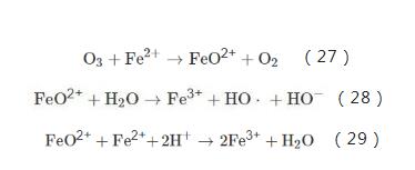 P. ASAITHAMBI等(deng)使用臭(chou)氧(yang)輔助電(dian)(dian)絮凝處(chu)理酒廠廢(fei)水(shui),主要考察(cha)了鐵鋁(lv)不同(tong)(tong)組合下聯合工藝的(de)協(xie)同(tong)(tong)效應,對色度(du)(du)和COD的(de)去除率較單一電(dian)(dian)絮凝和單一臭(chou)氧(yang)技術有(you)明顯提升;當電(dian)(dian)流密(mi)度(du)(du)為(wei)3 A/dm2,初始COD為(wei)2 500 mg/L,臭(chou)氧(yang)流量為(wei)15 L/min時,COD去除率達到83%,能耗為(wei)5.1 kW·h/m3,處(chu)理2 h后能夠完全去除色度(du)(du);在臭(chou)氧(yang)協(xie)同(tong)(tong)電(dian)(dian)絮凝處(chu)理污染物過程中,Fe2+與O3催化反應生(sheng)成中間產(chan)物FeO2+,Fe2+還會(hui)催化O3分解生(sheng)成·OH。具體反應機制如下: