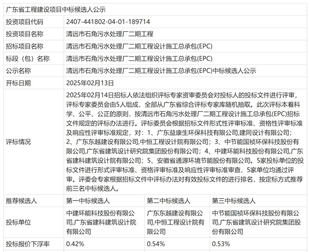 【谷騰環保網訊】2月14日,廣東清遠市石角污水處理廠二期工程設計施工總承包(EPC)中標候選人公示。