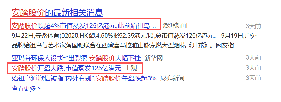 圖為多家媒體對安踏體育股價下挫的報道截圖。