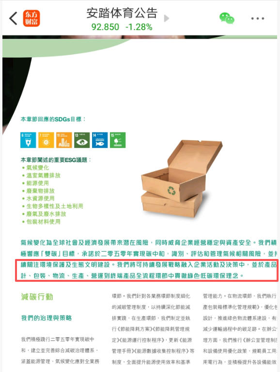 翻開安踏體育發布的《環境、社會及管治報告2024》在環境部分,開篇就提出,“我們將可持續發展戰略融入企業活動及決策中,并對產品設計、包裝、物流、生產、營運到終端產品全流程環節中貫徹綠色低碳環保理念”。據了解,為了達成2050年安踏體育的碳中和目標,其將減少碳排放等ESG績效指標納入到各相關部門。
