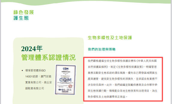 圖為安踏體育發布的《環境、社會及管治報告2024》對生物多樣性保護的承諾。