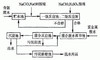 含(han)氰(qing)廢(fei)水(shui)首先進(jin)(jin)入(ru)貯水(shui)池(chi)(chi),在(zai)耐(nai)腐蝕離心(xin)泵(beng)抽取時,加(jia)入(ru)NaClO和(he)NaOH溶(rong)液,在(zai)一級反(fan)應(ying)(ying)(ying)池(chi)(chi)中發生不完全氧化(hua)反(fan)應(ying)(ying)(ying),進(jin)(jin)入(ru)二(er)級反(fan)應(ying)(ying)(ying)池(chi)(chi),再加(jia)入(ru)NaClO和(he)H2SO4溶(rong)液,混合(he)(he)液繼續完全氧化(hua)反(fan)應(ying)(ying)(ying)。采(cai)用快速定(ding)性(xing)監測(ce)法測(ce)定(ding)破氰(qing)結(jie)果(guo),處理(li)后(hou)(hou)(hou)的合(he)(he)格(ge)含(han)氰(qing)廢(fei)水(shui)(不合(he)(he)格(ge)的含(han)氰(qing)廢(fei)水(shui)被送回(hui)貯水(shui)池(chi)(chi),進(jin)(jin)行再處理(li))和(he)其他重金(jin)屬(shu)廢(fei)水(shui),分別由泵(beng)提(ti)升進(jin)(jin)入(ru)混合(he)(he)廢(fei)水(shui)調節池(chi)(chi),混合(he)(he)均質以保證后(hou)(hou)(hou)續物(wu)化(hua)處理(li)的連續性(xing)和(he)穩定(ding)性(xing),然后(hou)(hou)(hou)泵(beng)入(ru)混合(he)(he)反(fan)應(ying)(ying)(ying)池(chi)(chi)。該池(chi)(chi)主要利用重金(jin)屬(shu)離子和(he)堿液反(fan)應(ying)(ying)(ying),生成重金(jin)屬(shu)氫氧化(hua)物(wu)而去(qu)除(chu)(chu)。在(zai)沉淀(dian)(dian)池(chi)(chi)前投加(jia)凝(ning)聚劑,增強絮(xu)凝(ning)效果(guo)。污(wu)染物(wu)在(zai)沉淀(dian)(dian)池(chi)(chi)中繼續進(jin)(jin)行絮(xu)凝(ning)反(fan)應(ying)(ying)(ying),以達到進(jin)(jin)一步(bu)去(qu)除(chu)(chu)的目(mu)的。沉淀(dian)(dian)后(hou)(hou)(hou)污(wu)泥(ni)排入(ru)污(wu)泥(ni)濃縮池(chi)(chi),處理(li)出(chu)水(shui)經流(liu)量計計量后(hou)(hou)(hou)排放(fang)。污(wu)泥(ni)濃縮池(chi)(chi)接(jie)納混合(he)(he)反(fan)應(ying)(ying)(ying)池(chi)(chi)、沉淀(dian)(dian)池(chi)(chi)排出(chu)的物(wu)化(hua)污(wu)泥(ni),部分污(wu)泥(ni)回(hui)流(liu)到一沉池(chi)(chi),剩余(yu)的污(wu)泥(ni)經濃縮壓濾脫(tuo)水(shui)后(hou)(hou)(hou)外運(yun)處置。