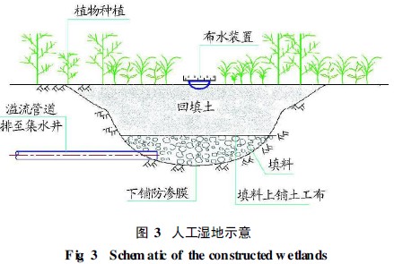 人工濕地深度(du)處(chu)(chu)理單元構造由進水區、處(chu)(chu)理區、出(chu)水區三(san)部分組成, 并且底部做(zuo)好防(fang)滲(shen)層 (圖3)。