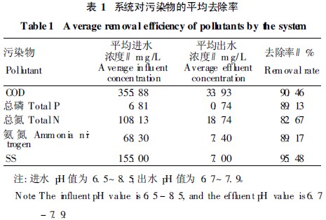 表1 列出了系(xi)(xi)統(tong)運行6 個多月的(de)污染物(wu)平(ping)均濃度和(he)去除率。由表1可以看出, 系(xi)(xi)統(tong)對COD、總(zong)磷、總(zong)氮(dan)、氨氮(dan)等污染物(wu)質均有良好的(de)去除效果(guo), 處(chu)理出水達到國(guo)家環境保護總(zong)局頒發的(de)《城鎮污水處(chu)理廠(chang)污染物(wu)排放標(biao)準》( GB18918 2002)一級(ji)B標(biao)準。