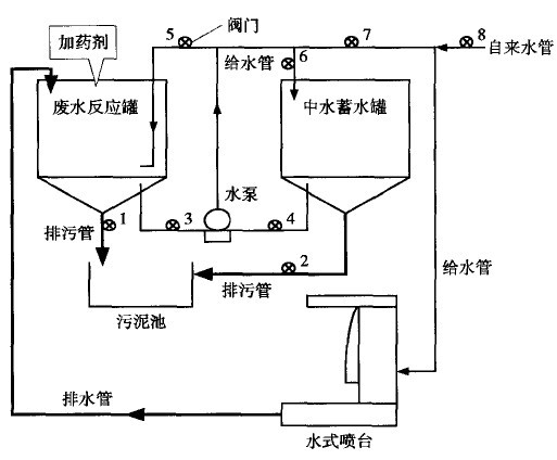 水(shui)(shui)(shui)罐內下(xia)部,水(shui)(shui)(shui)管出水(shui)(shui)(shui)口緊貼罐壁,如(ru)圖(tu)1所示,開(kai)啟閥(fa)門(men)3和(he)閥(fa)門(men)5,啟動水(shui)(shui)(shui)泵,廢水(shui)(shui)(shui)罐內的(de)(de)廢水(shui)(shui)(shui)在(zai)水(shui)(shui)(shui)泵的(de)(de)作用(yong)(yong)下(xia)會形成螺旋形的(de)(de)水(shui)(shui)(shui)流,能使(shi)藥劑與污水(shui)(shui)(shui)充分(fen)混合(he)反(fan)應。并經過8h以上的(de)(de)沉(chen)淀(dian)后(hou),開(kai)啟閥(fa)門(men)3和(he)閥(fa)門(men)6,通過水(shui)(shui)(shui)泵將沉(chen)淀(dian)后(hou)的(de)(de)上部中水(shui)(shui)(shui)提升到蓄水(shui)(shui)(shui)罐儲(chu)存。向噴(pen)臺(tai)(tai)供水(shui)(shui)(shui)時,噴(pen)臺(tai)(tai)內的(de)(de)污水(shui)(shui)(shui)經水(shui)(shui)(shui)泵回輸至(zhi)污水(shui)(shui)(shui)反(fan)應罐內,開(kai)啟閥(fa)門(men)4和(he)閥(fa)門(men)7,水(shui)(shui)(shui)泵將蓄水(shui)(shui)(shui)罐中的(de)(de)中水(shui)(shui)(shui)輸送至(zhi)各個(ge)噴(pen)臺(tai)(tai)使(shi)用(yong)(yong)。噴(pen)臺(tai)(tai)內的(de)(de)循環用(yong)(yong)水(shui)(shui)(shui)經過一段時間的(de)(de)使(shi)用(yong)(yong)后(hou),水(shui)(shui)(shui)分(fen)的(de)(de)蒸發會減(jian)少(shao),開(kai)啟閥(fa)門(men)8可(ke)以直(zhi)接(jie)向水(shui)(shui)(shui)處理系統補水(shui)(shui)(shui)。