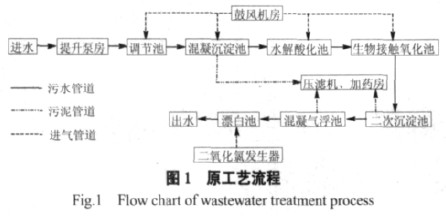 陜西(xi)咸(xian)陽3530 印染廠原(yuan)有污水處(chu)理(li)(li)設施采用(yong)混(hun)凝+ 水解酸(suan)(suan)化+ 生物接觸(chu)氧化+ 溶氣氣浮+ 漂(piao)白(bai)工藝處(chu)理(li)(li),處(chu)理(li)(li)費用(yong)高且效果(guo)不(bu)理(li)(li)想,超標排放(fang)。究(jiu)其原(yuan)因,主要為混(hun)凝工段(duan)(duan)去(qu)除的COD 和色度(du)的效果(guo)不(bu)佳,水解酸(suan)(suan)化階段(duan)(duan)由于(yu)殘(can)留鋁配體產生毒(du)性,營養缺乏,廢水和污泥未(wei)充分接觸(chu)等原(yuan)因處(chu)理(li)(li)效率不(bu)高;好(hao)氧段(duan)(duan)未(wei)能完全消耗BOD5 等。