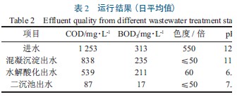 該污(wu)(wu)水(shui)(shui)處(chu)理工程中試與2008 年3 月(yue)(yue)開始。為縮短好(hao)氧(yang)活性污(wu)(wu)泥培(pei)養時間,采用(yong)附(fu)近(jin)印染(ran)廠剩余污(wu)(wu)泥作(zuo)為接種污(wu)(wu)泥,按比例進行(xing)N、P 等元素的補加。經過(guo)一(yi)個月(yue)(yue)的培(pei)養,污(wu)(wu)泥培(pei)養成熟并進行(xing)數(shu)據檢測(ce),運行(xing)三個月(yue)(yue),系(xi)統穩定(ding)且各項指(zhi)標(biao)(biao)(biao)(見表2)均能達(da)到(dao)渭河水(shui)(shui)系(xi)(陜(shan)西段)污(wu)(wu)水(shui)(shui)綜合排放(fang)標(biao)(biao)(biao)準(zhun)的二級(ji)標(biao)(biao)(biao)準(zhun);提高污(wu)(wu)泥濃度至2.5 g·L-1 時,可以實現(xian)(xian)出(chu)水(shui)(shui)符合《紡織染(ran)整工業水(shui)(shui)污(wu)(wu)染(ran)排放(fang)標(biao)(biao)(biao)準(zhun)》一(yi)級(ji)標(biao)(biao)(biao)準(zhun)[6]。運行(xing)過(guo)程中,發(fa)現(xian)(xian)以下幾點對(dui)系(xi)統高效、穩定(ding)運行(xing)和保(bao)證出(chu)水(shui)(shui)達(da)標(biao)(biao)(biao)排放(fang)起重要(yao)作(zuo)用(yong)。