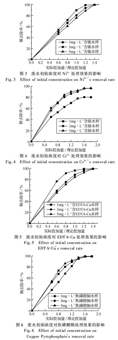 分(fen)(fen)析各圖可知,對于(yu)Ni2+和EDTA-Cu,廢水(shui)初(chu)(chu)始(shi)濃(nong)(nong)度(du)(du)為(wei)(wei)1.0 mg·L-1時(shi),最(zui)(zui)佳(jia)(jia)(jia)投加(jia)(jia)量(liang)為(wei)(wei)理(li)(li)論(lun)投加(jia)(jia)量(liang)的(de)(de)(de)(de)1.2倍(bei)(bei)左(zuo)(zuo)右(you),初(chu)(chu)始(shi)濃(nong)(nong)度(du)(du)為(wei)(wei)5.0 mg·L-1時(shi),最(zui)(zui)佳(jia)(jia)(jia)投加(jia)(jia)量(liang)是(shi)理(li)(li)論(lun)投加(jia)(jia)量(liang)的(de)(de)(de)(de)1.4倍(bei)(bei)左(zuo)(zuo)右(you),初(chu)(chu)始(shi)濃(nong)(nong)度(du)(du)為(wei)(wei)3.0 mg·L-1時(shi),最(zui)(zui)佳(jia)(jia)(jia)投加(jia)(jia)量(liang)為(wei)(wei)理(li)(li)論(lun)投加(jia)(jia)量(liang)的(de)(de)(de)(de)1.2~1.4倍(bei)(bei).類(lei)似,對于(yu)Cr3+和焦磷酸銅,其(qi)廢水(shui)初(chu)(chu)始(shi)濃(nong)(nong)度(du)(du)為(wei)(wei)1.0、3.0、5.0 mg·L-1時(shi)的(de)(de)(de)(de)捕(bu)集劑最(zui)(zui)佳(jia)(jia)(jia)投加(jia)(jia)量(liang)分(fen)(fen)別為(wei)(wei)1.5倍(bei)(bei)、1.5~1.6倍(bei)(bei)和1.6倍(bei)(bei)的(de)(de)(de)(de)理(li)(li)論(lun)投加(jia)(jia)量(liang).