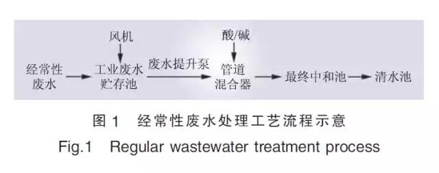 電廠(chang)工業廢(fei)(fei)水(shui)(shui)(shui)(shui)(shui)(shui)(shui)(shui)(shui)(以(yi)下簡稱工業廢(fei)(fei)水(shui)(shui)(shui)(shui)(shui)(shui)(shui)(shui)(shui))處(chu)理(li)(li)系(xi)統設計出力10 m3/h。根據工業廢(fei)(fei)水(shui)(shui)(shui)(shui)(shui)(shui)(shui)(shui)(shui)的排放周期, 將其分為(wei)經(jing)常(chang)(chang)性(xing)廢(fei)(fei)水(shui)(shui)(shui)(shui)(shui)(shui)(shui)(shui)(shui)和非經(jing)常(chang)(chang)性(xing)廢(fei)(fei)水(shui)(shui)(shui)(shui)(shui)(shui)(shui)(shui)(shui)。經(jing)常(chang)(chang)性(xing)廢(fei)(fei)水(shui)(shui)(shui)(shui)(shui)(shui)(shui)(shui)(shui)主要包括(kuo)水(shui)(shui)(shui)(shui)(shui)(shui)(shui)(shui)(shui)處(chu)理(li)(li)除(chu)鹽設備(bei)再生排水(shui)(shui)(shui)(shui)(shui)(shui)(shui)(shui)(shui)、過濾(lv)器(qi)(qi)沖洗(xi)排水(shui)(shui)(shui)(shui)(shui)(shui)(shui)(shui)(shui)、反(fan)滲(shen)透排水(shui)(shui)(shui)(shui)(shui)(shui)(shui)(shui)(shui)、凝(ning)結水(shui)(shui)(shui)(shui)(shui)(shui)(shui)(shui)(shui)精(jing)處(chu)理(li)(li)裝置(zhi)再生排水(shui)(shui)(shui)(shui)(shui)(shui)(shui)(shui)(shui)等; 非經(jing)常(chang)(chang)性(xing)廢(fei)(fei)水(shui)(shui)(shui)(shui)(shui)(shui)(shui)(shui)(shui)主要包括(kuo)空氣預熱器(qi)(qi)清(qing)洗(xi)廢(fei)(fei)水(shui)(shui)(shui)(shui)(shui)(shui)(shui)(shui)(shui)、除(chu)塵器(qi)(qi)沖洗(xi)水(shui)(shui)(shui)(shui)(shui)(shui)(shui)(shui)(shui)、鍋爐化學清(qing)洗(xi)廢(fei)(fei)水(shui)(shui)(shui)(shui)(shui)(shui)(shui)(shui)(shui)、主廠(chang)房(fang)地面沖洗(xi)水(shui)(shui)(shui)(shui)(shui)(shui)(shui)(shui)(shui)等。對于經(jing)常(chang)(chang)性(xing)的廢(fei)(fei)水(shui)(shui)(shui)(shui)(shui)(shui)(shui)(shui)(shui), 處(chu)理(li)(li)方式為(wei):經(jing)各自的收集(ji)(ji)系(xi)統收集(ji)(ji)至廢(fei)(fei)水(shui)(shui)(shui)(shui)(shui)(shui)(shui)(shui)(shui)集(ji)(ji)中處(chu)理(li)(li)站廢(fei)(fei)水(shui)(shui)(shui)(shui)(shui)(shui)(shui)(shui)(shui)貯(zhu)存池(chi)內, 用泵及壓(ya)縮(suo)空氣進(jin)行攪拌、曝氣, 混合均勻后用泵送至最終中和池(chi), 調整pH值后流入清(qing)水(shui)(shui)(shui)(shui)(shui)(shui)(shui)(shui)(shui)池(chi), 工藝流程如圖1所示。