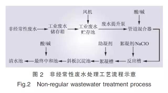 非經常(chang)性廢(fei)水(shui)(shui)(shui)處(chu)理系(xi)統工藝流(liu)(liu)程(cheng)如圖2所(suo)示, 調(diao)整pH值后的(de)廢(fei)水(shui)(shui)(shui)先后經過(guo)反(fan)應(ying)槽、絮(xu)(xu)凝槽完(wan)成凝聚(ju)、絮(xu)(xu)凝反(fan)應(ying), 然后進入斜板沉淀(dian)池(chi)完(wan)成絮(xu)(xu)凝體與水(shui)(shui)(shui)的(de)分離。沉淀(dian)池(chi)上(shang)部(bu)的(de)清水(shui)(shui)(shui)自流(liu)(liu)進入最終中和池(chi)進行pH值調(diao)整, 最終出水(shui)(shui)(shui)流(liu)(liu)入清水(shui)(shui)(shui)池(chi), 與經常(chang)性廢(fei)水(shui)(shui)(shui)匯總(zong)。
